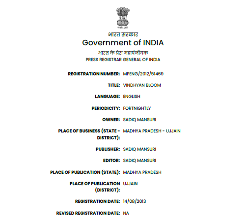 Registered under RNI No. MPENG/2012/51469 with ISSN 2319-8478 since 14 August 2013, Vindhyan Bloom is owned, published, and edited by Sadiq Mansuri. Upholding strong editorial ethics and academic standards, the journal focuses on authentic research, critical analysis, and meaningful expression, contributing to knowledge dissemination at national and international levels.